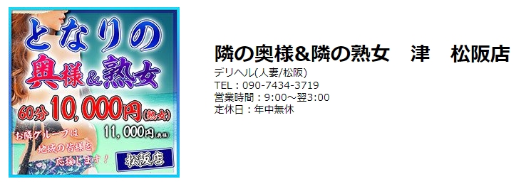 松阪でおすすめデリヘル①:「隣の奥様&隣の熟女 津・松阪店」