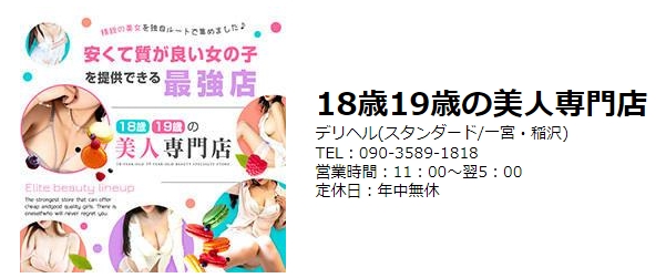 | 18歳19歳の美人専門店 | 60分:10,000円~ | 日本人ばなれしたスタイルの良い女の子が在籍している韓国系デリヘル |